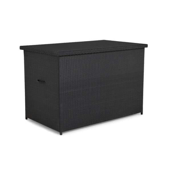 VENTURE DESIGN Amazon hyndeboks har et moderne, rektangulært formsprog og et afdæmpet, sort finish der løfter terrassens stemning. Kombinationen af sort rattan og slanke ståldetaljer skaber et elegant og roligt udtryk, som passer
