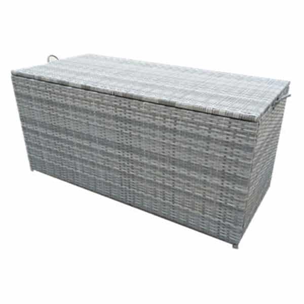 VENTURE DESIGNs rektangulære London hyndeboks kombinerer grå rattan og slank stålramme for et afdæmpet, nordisk udtryk der løfter din terrasse. Den enkle silhuet passer både moderne og klassiske haverum og skaber ro og harmoni